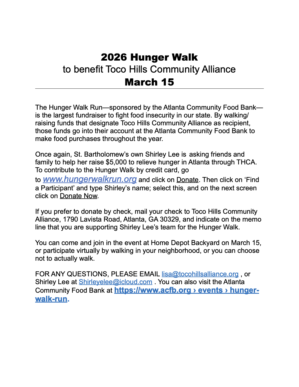 Help our own Shirley Lee raise $5,000 to relieve hunger in Atlanta through the 2026 Hunger Walk to benefit Toco Hills Community Alliance (THCA). For more information about this event, including how to contribute, click here.